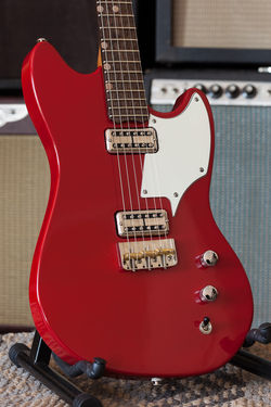 Unlike similarly styled guitars, this guitar is characterized by a full thickness solid mahogany or maple body, wenge or mahogany neck with maple center strip, rosewood or wenge fretboard, and simple volume and tone configuration with 3 way toggle.